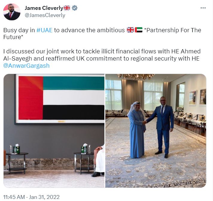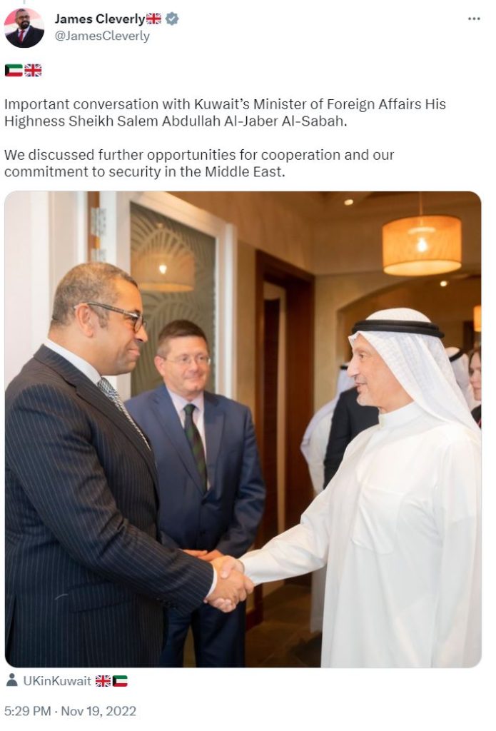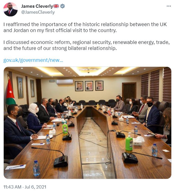 Cleverly was from February 2020 a foreign minister, before being promoted to foreign secretary by the hapless Liz Truss in September 2022. Here he is in increasingly repressive Jordan reaffirming “our strong bilateral relationship”.