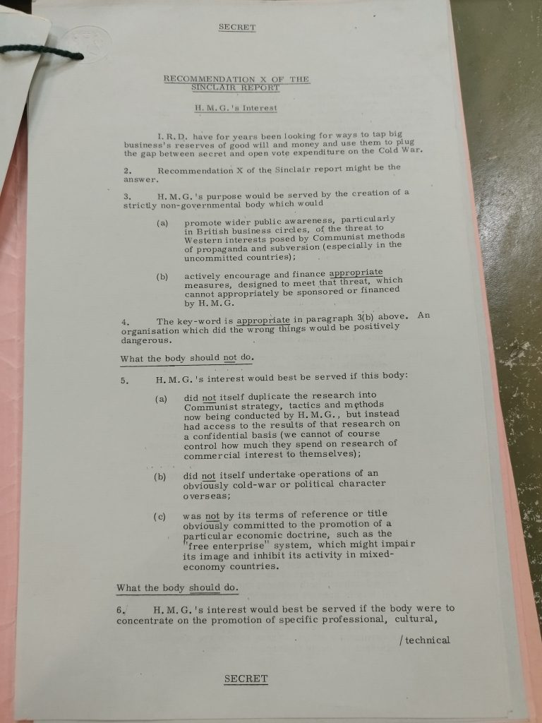 It would also solve the problem of a “shortage of public money” for covert British propaganda activities. As such, Hopson concluded, “Recommendation X of the Sinclair report might be the answer” to the IRD’s difficulties.
